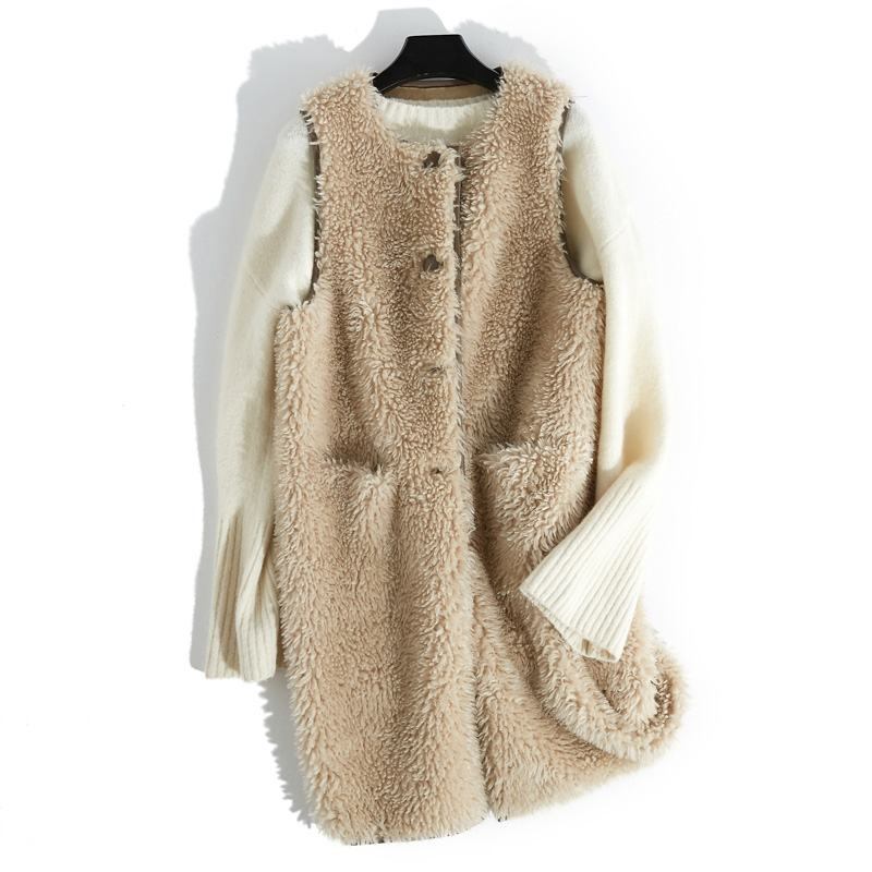 Baro 2018 automne et hiver nouveau manteau de fourrure de mouton manteau dames col rond gilet long manteau en laine Haining